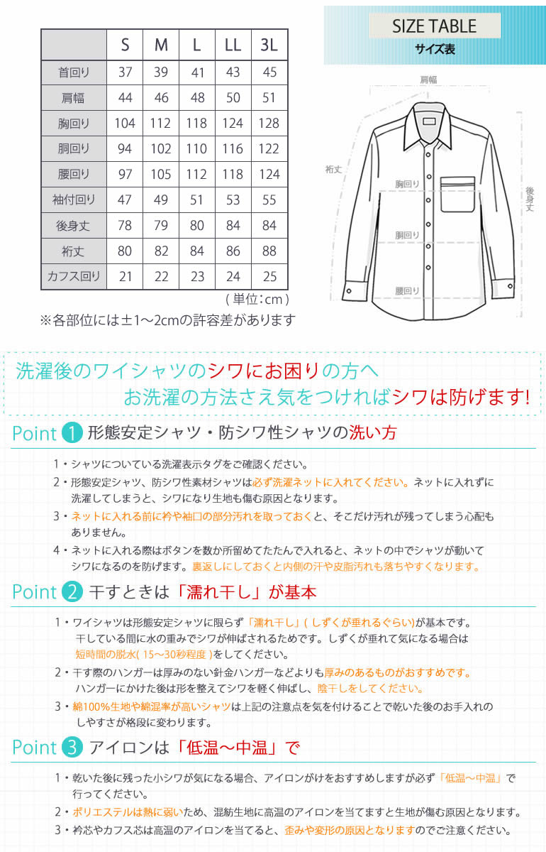 サイズSMLLL3L衿回り3739414345肩幅5051525354胸回り112116120124128胴回り108112116120124腰回り112116120124128カフス回り2424.5252627着丈7880828484裄丈8082848688型番SHIRT-XR011商品情報材質:綿45% ポリエステル55%ポケット数:1袖口の調整できるアジャスターボタン付きスペアーボタン付きサイズS/M/L/LL/3L付属品-トレンドキーワード-この商品のお問い合わせ番号TSR-item-0000678-cp